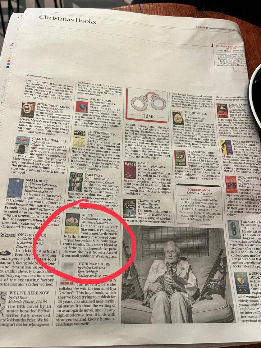 While I was there, a friend sent me a screenshot of my novella Aerth... mentioned as one of the best books of 2025 in the Daily Telegraph Christmas Books supplement. This is tremendously exciting! I must say I found it difficult to sleep that night. Aerth is one of just 21 novels mentioned in that part of the list. Online, it links to the stunning review by the Telegraph's critic Luke Kennard, which was published in January, just before the book came out.